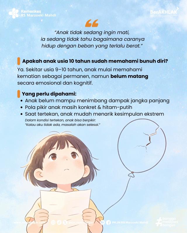 Pada anak, keinginan bunuh diri sering kali bukan tentang kematian, melainkan tentang rasa putus asa yang tidak mampu mereka ungkapkan dengan kata-kata. Diam, perubahan perilaku, menarik diri, atau ledakan emosi bisa menjadi sinyal bahwa anak sedang membutuhkan pertolongan.