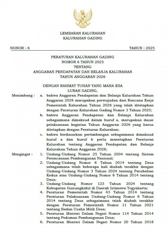 Peraturan Kalurahan Gading Nomor 6 Tahun 2025